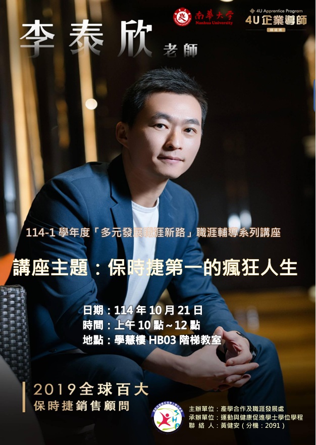 活動簡介(Introduction):此講座可認列「南華大學協助經濟不利學生學習輔導獎助辦法」職能培育獎勵,詳細內容請至相關申請網站查詢https://reurl.cc/ekVoaj。