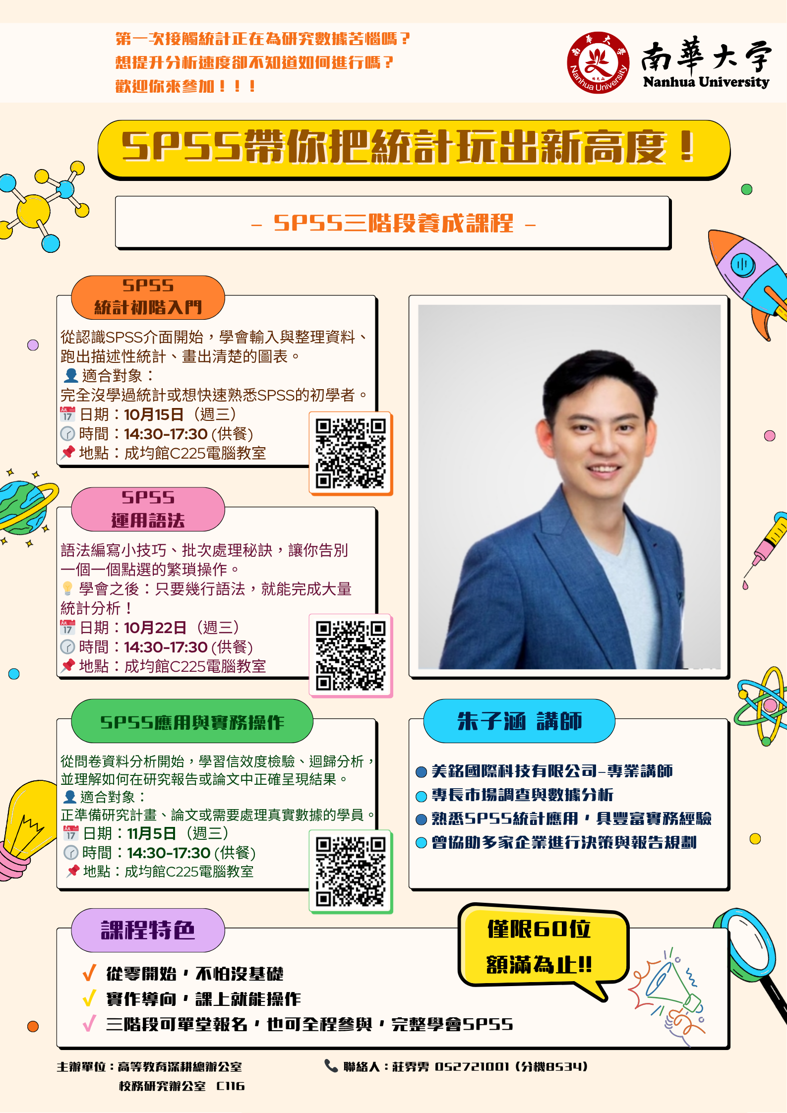 讓SPSS課程幫助你一步步打穩基礎、累積技能,最後真正應用在實務中!使SPSS不再只是冷冰冰的統計軟體,而是幫助你完成研究、論文與專案的超強工具!