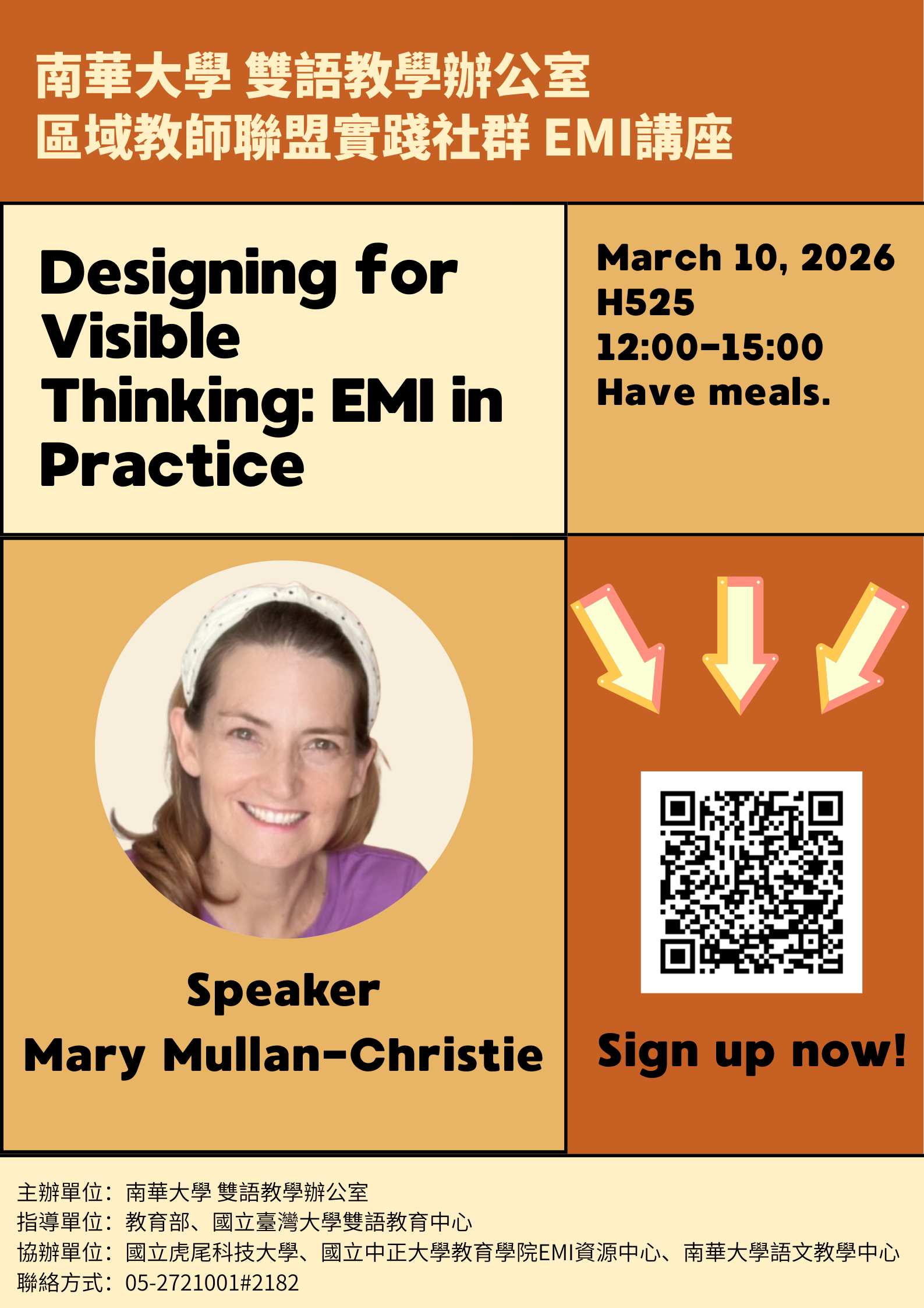 活動簡介(Introduction):●本次EMI講座再次特別邀請到臺灣南非交流協會慕喬絲理事長Mary Mullan-Christie,Mary 老師將分享如何透過具挑戰性的互動活動,引導學生實際使用英語進行溝通與解決問題,從被動學習轉向主動參與,進而提升英語應用能力。