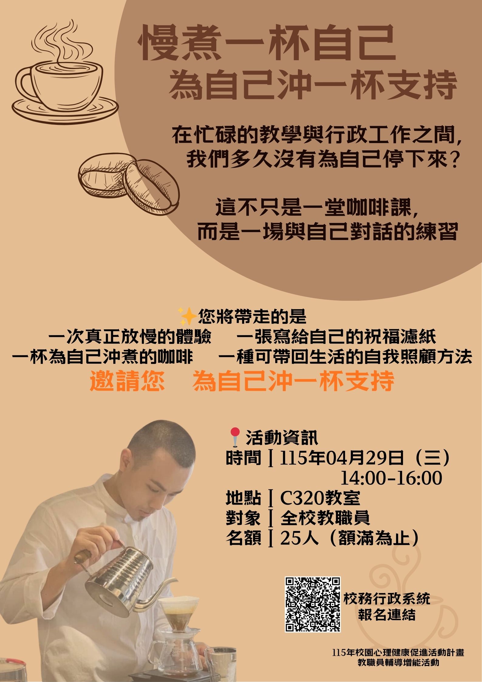 活動名稱(Activity Name):114-2教職員輔導增能活動-《慢煮一杯自己》為自己沖一杯支持