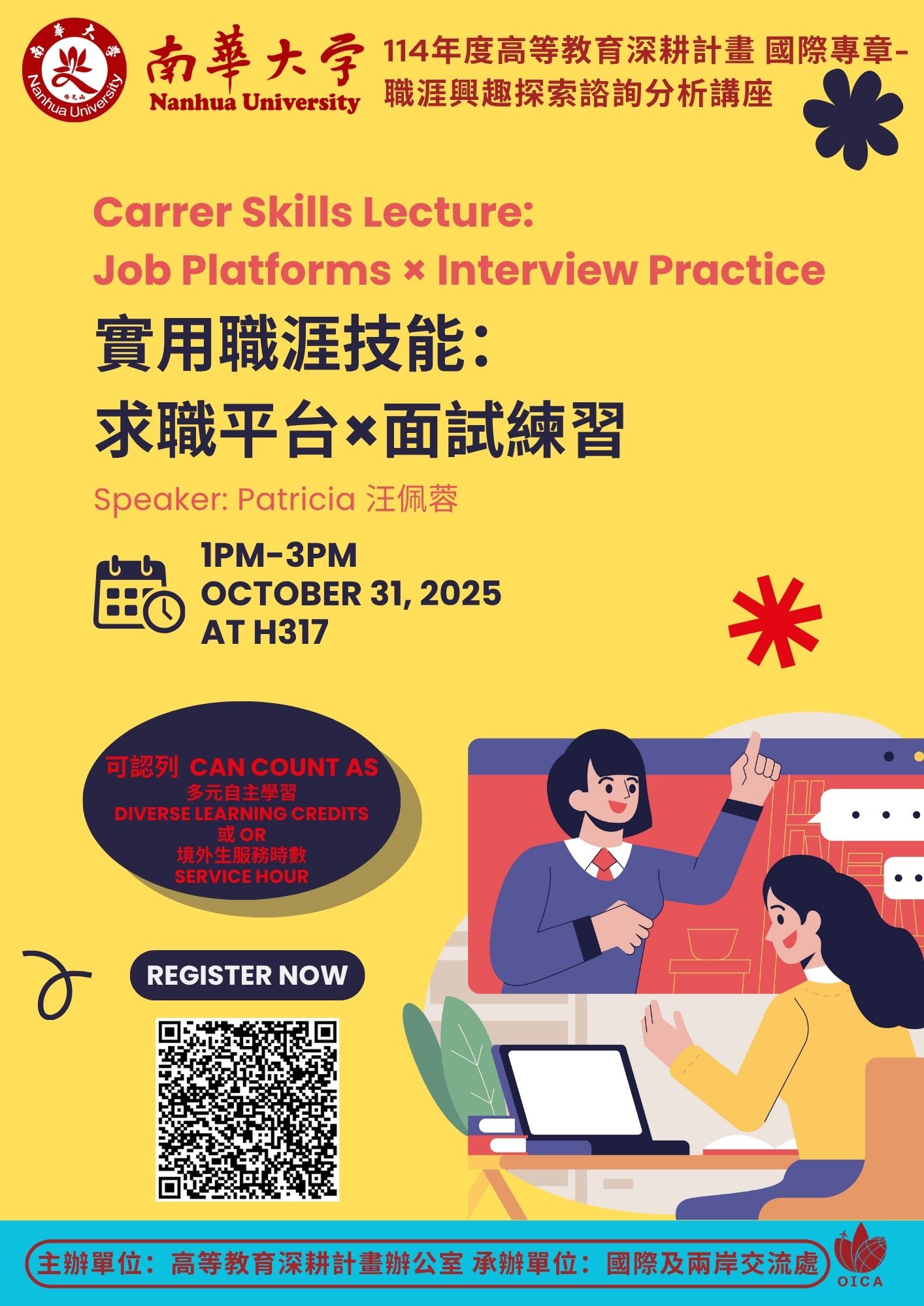 【國際及兩岸交流處 OICA】職涯興趣探索諮詢分析講座:實用職涯技能:求職平台×面試練習 Career Interest Exploration and Consultation Analysis Lecture: Carrer Skills Lecture: 待定